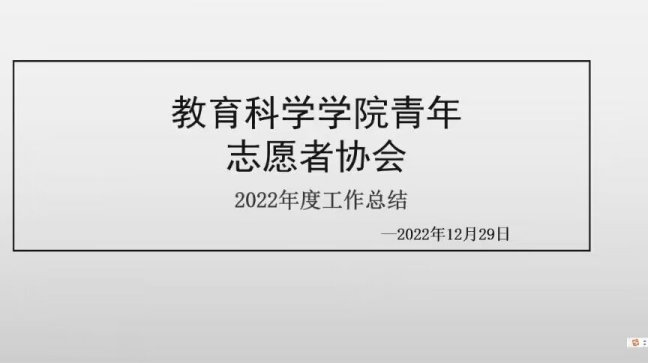 (通讯员 吴彤)2022年12月29日晚上20:00,教育科学学院(以下简称“教科院”)青年志愿者协会于腾讯会议召开教科院青年志愿者协会2022年度工作总结线上会议,参与此次会议的人员包括教科院分团委副书记唐志强、教科院青年志愿者协会全体成员。