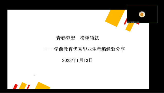 本网讯(通讯员 向洁)为回应学生关切,助力学生成长,扎实推进学前教育国家一流本科专业建设,1月13日晚,教育科学学院学前教育系通过腾讯会议举行优秀校友经验交流会,学前教育系老师和180多名学生参加了本次会议。会议由学前教育系主任朱会从老师和22级学生王思颖共同主持。