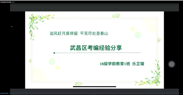 会上,来自2017级和2018级的张燕妮、乐芷璇、解心怡、熊语嫣、宋梦琪、雷怡可、罗天娇、李雪雯、魏文婧、潘熹等10位优秀校友先后作考编与工作经验交流。其中,在武昌区幼儿园就职的乐芷璇结合个人成长经历,从信息收集、规划制定、题目复盘、心态保持四个方面与学弟学妹分享事业编制考试心得体会;2018级学前毕业生宋梦琪交流了洪山区幼儿园教师考核要求及个人实战经验;其他校友也从时间安排、才艺展示、集体教学活动技能修炼等方面为学前教育专业学生送出“锦囊妙计”,提醒同学们注意教姿教态、与幼儿良好互动。