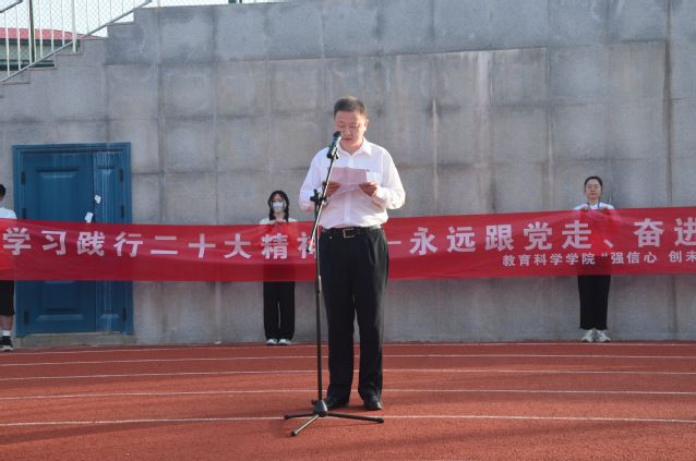(通讯员 张丽雯)4月17日早七时,教育科学学院(以下简称教科院)“秉持初心,砥砺前行,请党放心,强国有我——国旗下的讲话”主题教育活动在综合运动场举行。学校党委副书记胡兴、校党政办公室、基建处、团委等“师友·学友”联系职能部门领导、教科院领导班子成员、全体辅导员、学生代表参加,活动由2021级小学教育4班余忆婷主持。