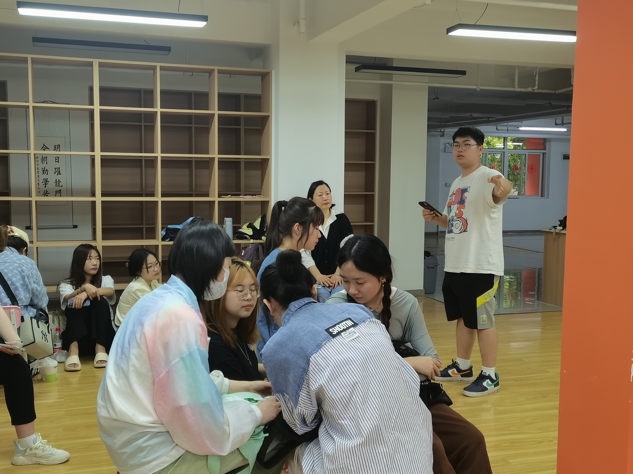 10:30,各小组轮流分享本组的环境设计方案,然后在陈纳老师的指导下,在真实的空间里对多个方案进行重组和优化,最终确定了制作区、实验区、游戏区、绘本区、观影区等,以及主题墙和“光影隧道”等多个区域。之后,各小组认领某一个区域,进一步设计区域标识、入区规则、活动主题以及需要投放的材料。活动过程中,社区工作人员随叫随到,耐心地解答同学们的各种问题,热情地鼓励大家大胆想象和创新,并表示将尽最大努力提供人力和物力方面的支持。