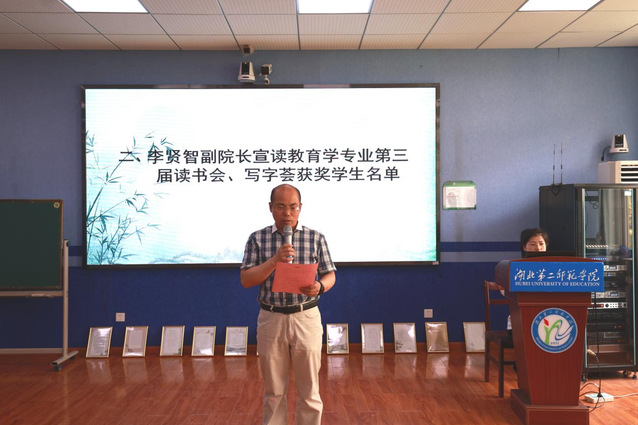 (通讯员 彭文帆)为深入贯彻落实习近平总书记有关“四有好老师”“立德树人”等讲话精神,秉承伟大的人民教育家陶行知先生的“教学做合一”理念,4月20日中午12:40,湖北第二师范学院教育科学学院(以下简称“教科院”)于实验楼5209教室举办教育学专业第三届“读吧”读书会、“写吧”写字荟颁奖典礼。教科院分党委书记乐三明、教科院副院长李贤智、教育学专业全体教师出席,2020级与2021级教育学专业学生参加本次活动。典礼由2021级教育学1班邱钦云同学主持。