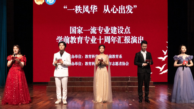 (通讯员 周欣雨 张雨涵)为坚持立德树人根本任务,加大一流专业建设点建设保障力度,积极促进我校学前教育专业发展与展示阶段性教育成果,立足于培养一专多能的复合型人才,4月27日晚,由教育科学学院(以下简称“教科院”)学前教育专业主办,教科院青年志愿者协会承办的“一秩风华,从心出发”学前教育专业十周年纪念暨专业汇演在大礼堂举行。校党委副书记胡兴、教务处处长刘永存、学工部部长文敏、学科办处长张炜、教务处副处长陈荣、学工部副部长刘兴,教科院领导,学前教育专业教师,毕业校友及在校师生出席本次汇演。