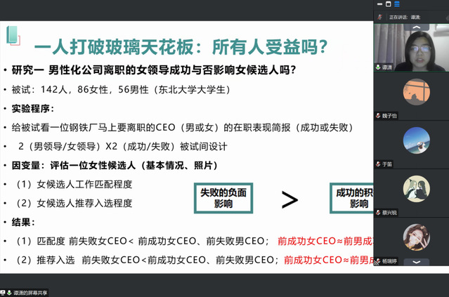 首先,谭潇老师按照选题解读、作者简介、研究背景和前沿、研究设计、研究结果、现实意义等几个方面展开讲解。在研究背景环节,谭老师引入了“在接受传统男性职业或者领导位置上的女性,是否会促进其他女性成为领导者?”的观点。接着,谭老师就研究设计中的五个子研究进行详细说明。随后,谭老师带领大家探讨了文章的研究结论以及现实意义。在谭老师的分享结束后,师生积极发言,充分肯定了谭老师分享的趣味性与实用性。与此同时,大家对于文章中使用的5个分研究的设计产生极大的兴趣,并且一致认为该研究的实验过程十分巧妙且角度新颖,这将对自己未来的研究提供了新的思考方向。