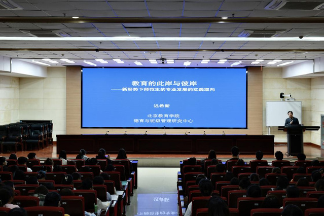 (通讯员 孙雅鑫)5月10日下午2点,湖北第二师范学院教育科学学院(以下简称“教科院”)与长江班主任研究中心共同举办的专题讲座于新图书馆一号报告厅顺利开展。北京教育学院校长研修学院迟希新教授为教科院师范生带来了一场别开生面的讲座——教育的此岸与彼岸:新形势下师范生专业发展的教育实践取向。教科院副教授,长江班主任研究中心主任曹斯出席,2020级与2021级教育学专业以及2022级教育学类专业全体学生参加此次讲座,讲座由2021级小学教育专业研究生方菊主持。