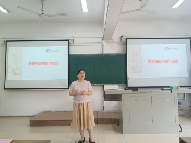 接着,代黎明为毕业生党员上最后一次党课。她以“教育强国与青年担当”为主题,从教育强国的战略地位、建设教育强国的六条原则以及如何办好令人民满意的教育三个方面进行讲解。她重点强调作为师范专业学生党员,应当落实“四有好老师”与“四个引路人”的具体要求,同时,要坚持立德树人,坚持文化引领与思想引领,增强建设教育强国的责任感、使命感、紧迫感,为国家发展贡献力量。