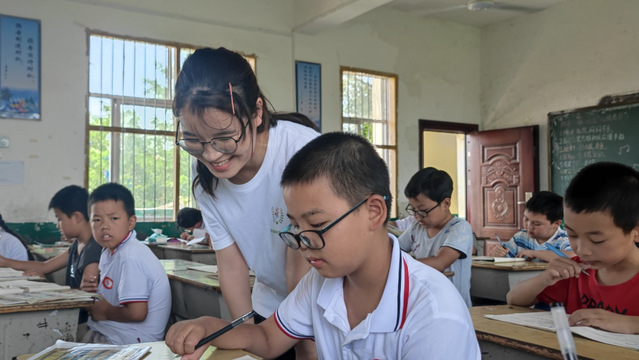 (图为志愿者对当地学生暑期作业进行教育指导工作)