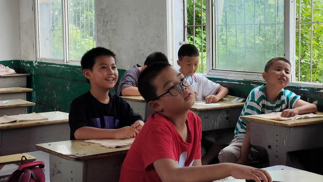 (图为小朋友们上课认真听志愿者讲课)