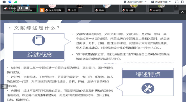 会议伊始,学生助理魏子怡就暑期写作的两项任务做出说明讲解,并展示2022年暑期写作任务的表彰通知,激励训练营成员认真对待暑期写作任务,随后,21级教育学1班魏子怡、丁婵宇同学分享撰写文献综述的经验,依次从“文献综述是什么”,“为什么要写文献综述”,“文献综述由哪几个方面构成”,“如何写文献综述”,“写作格式与注意点”五个方面来对文献综述进行讲解和说明。