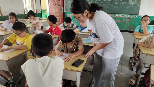 (志愿者在教学生绘画熊猫)