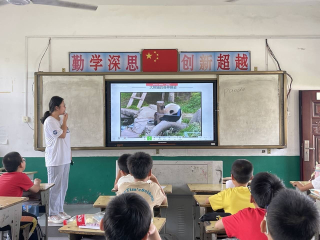 (志愿者为学生播放熊猫视频)