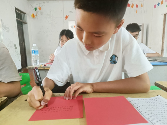 (图为学生在红色卡纸上写上自己想说的话来折红船)