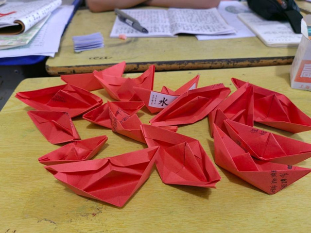 (图为四叶草青年志愿服务队志愿者带领学生在卡纸上写自己的愿望,并指导学生折成纸船)