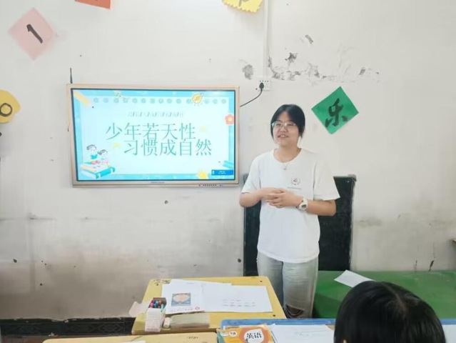 (图为四叶草青年志愿服务队志愿者为学生讲解“习惯的养成”主题系列活动)