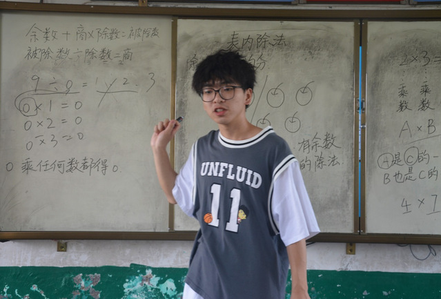 (图为志愿者在数学课上为二年级学生讲除法的知识)