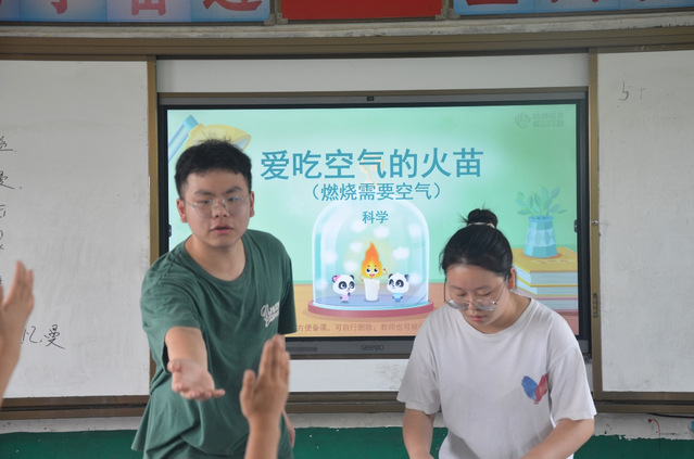 (为志愿者为孩子们开展关于“燃烧需要空气”的科学课)