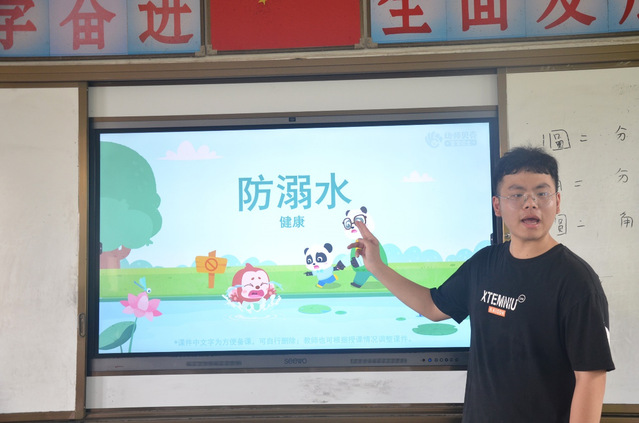 (图为志愿者正在给孩子们进行防溺水安全教育)