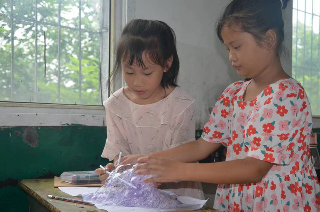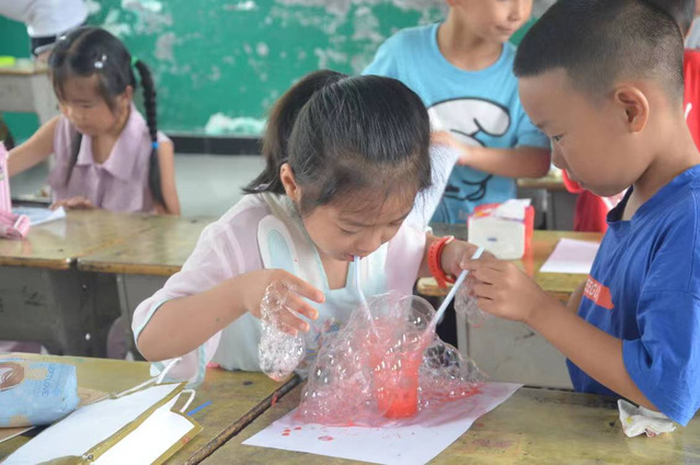 (通讯员 李宇惠)为了让监利市分盐镇桃花小学的孩子们体验绘画的乐趣,培养孩子们的审美能力,激发孩子们的感知能力、想象能力与创造能力,2023年7月16日星期日,湖北第二师范学院四叶草青年志愿服务队第二分队的志愿者们在暑期“三下乡”社会实践活动中在监利市分盐镇桃花小学开展趣味泡泡画活动。志愿者蔡贝贝与志愿者夏玉博在桃花小学一二年级班级中开展泡泡画课程,带领一二年级的孩子们利用塑料杯、吸管、颜料和洗洁精,展开丰富的想象进行创作。