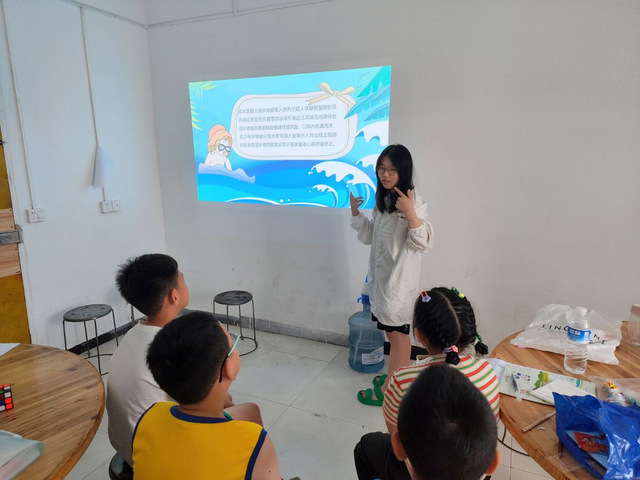 志愿者袁恭棁分别从溺水的急救方法、游泳的注意事项、落水不要错误施救、落水自救方法四个方面展开讲解。课堂上,志愿者袁恭棁通过举例说明溺水后表现出来的生理反应,结合朗读防溺水知识,请小朋友们上台演示急救方法。这种方式不仅能加强小朋友们的记忆,也能更好地将学习到的理论知识运用到实践中去。课后,邓宇泽小朋友说到,他之前在学校里也有过此类班会课,但是此次班会课丰富了他的知识面,实操性也更强。