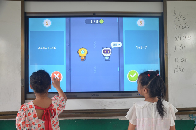 (图为在一年级的数学课上,志愿者让孩子们两两为一组,上讲台进行算术比赛)