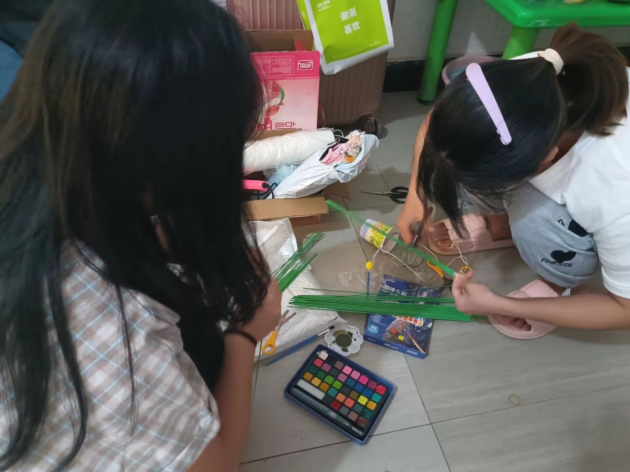 (图为四叶草青年志愿服务队队员王姝杰与刘安娜为手工课做准备)