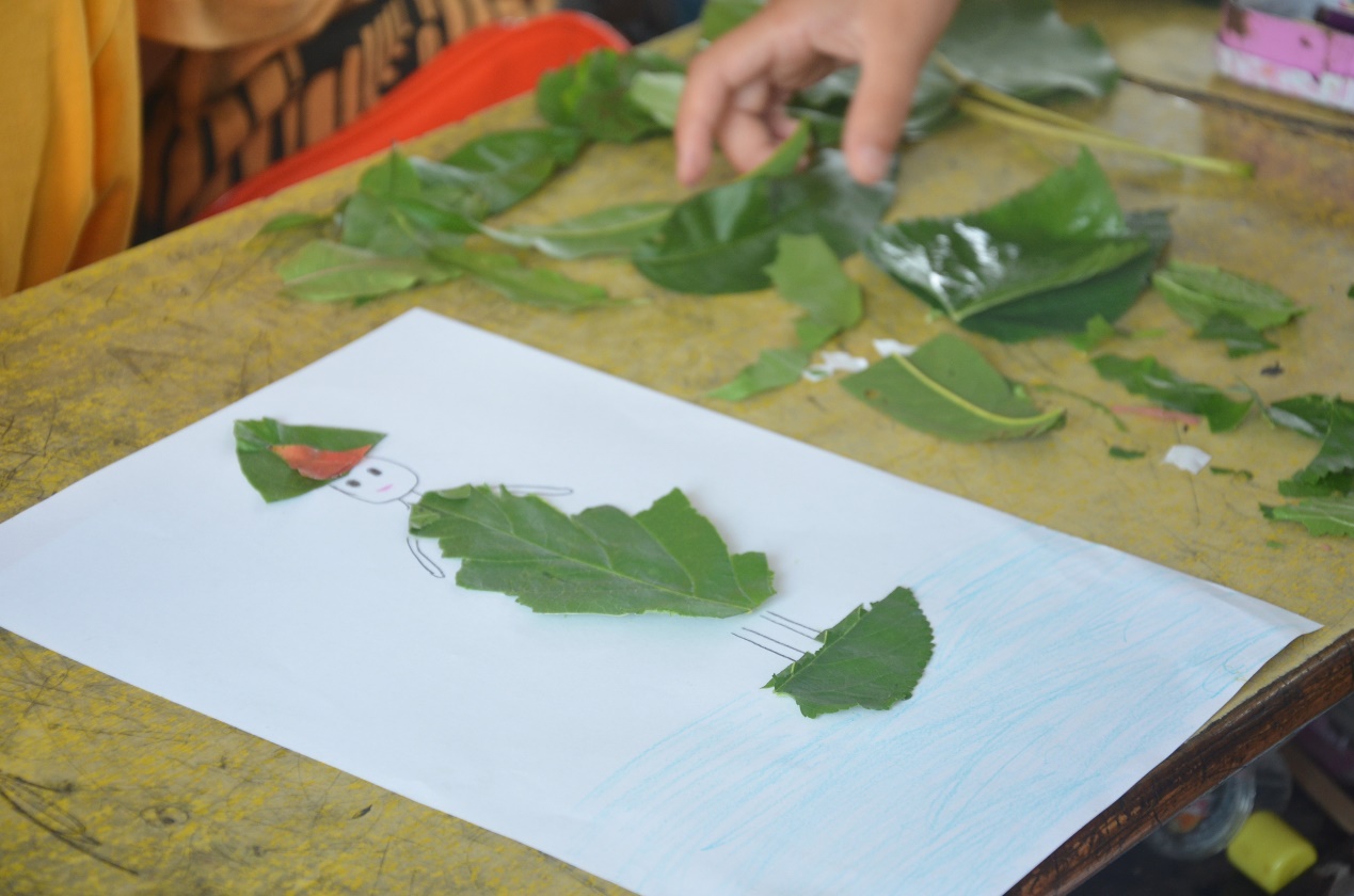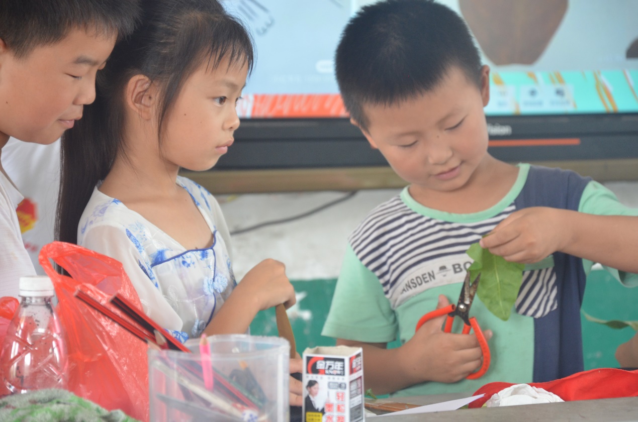 (图为孩子们正在课堂上修剪自己收集到的树叶)