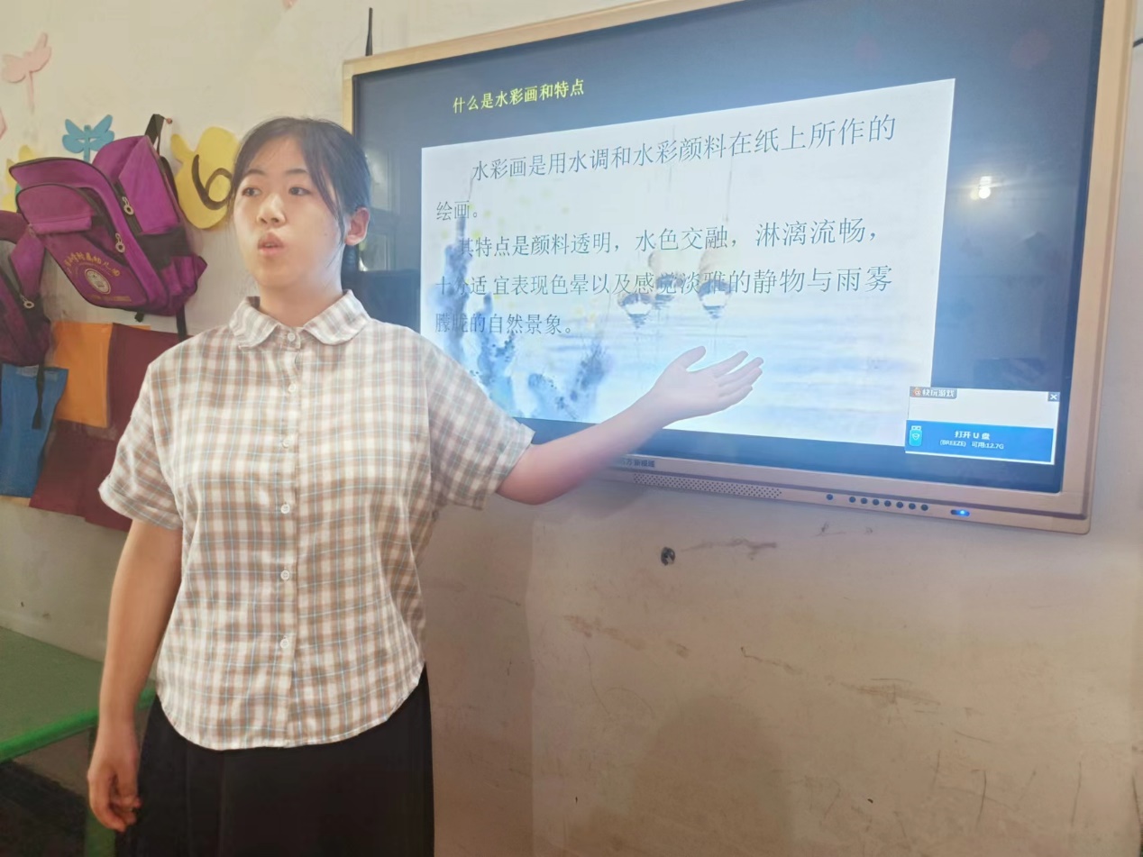 (图为四叶草青年志愿服务队第一分队志愿者王姝杰为同学们讲解水彩画的特点和常用画法)