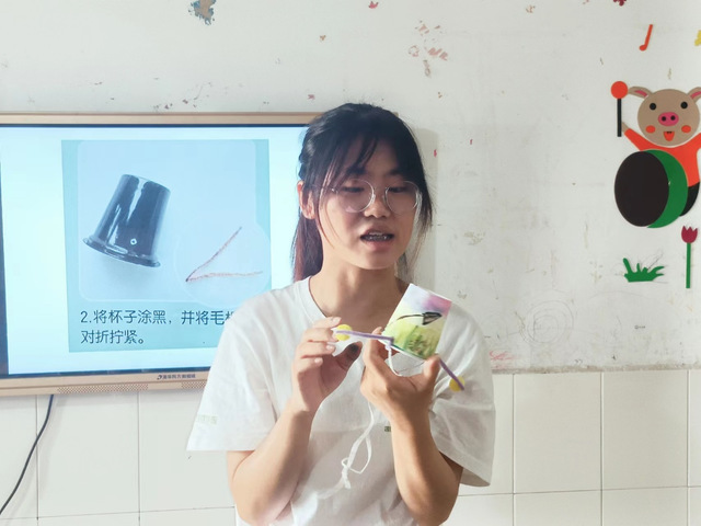 (图为四叶草青年志愿服务队第一分队志愿者刘安娜为同学们示范)