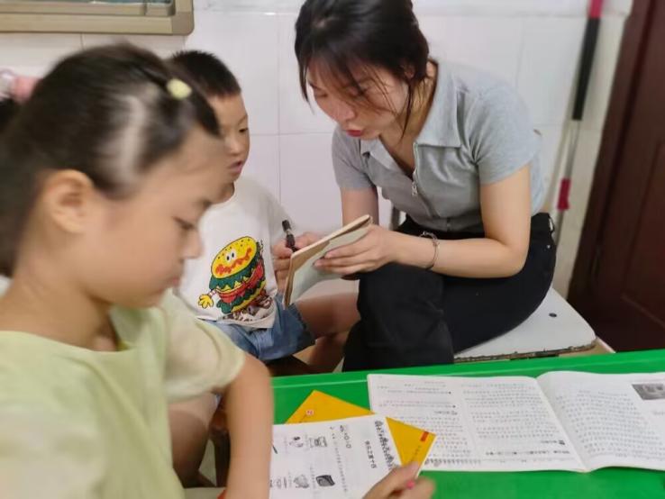 (图为支教志愿者向学生讲解暑期练习作业,学生很认真的听讲)