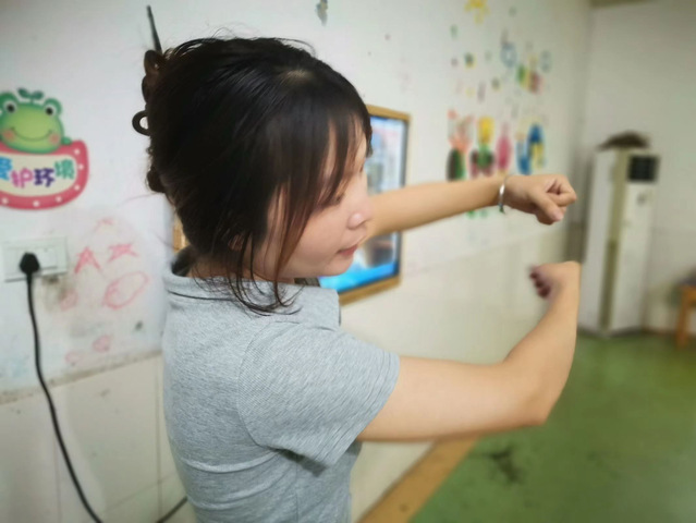 (图为四叶草青年志愿服务队第一分队志愿者邹贤艳用肢体演示地球的自转和公转)