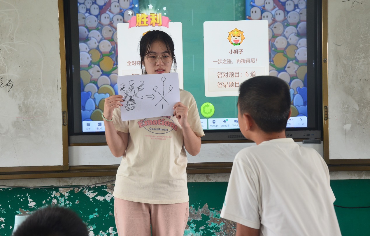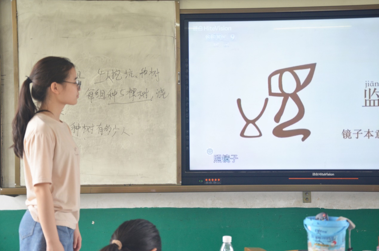 (通讯员 李文冠)今天是湖北第二师范学院四叶草青年志愿服务队(以下简称四叶草)在湖北省监利市开展暑期三下乡社会实践活动的14天。在过去两周的支教中,志愿者积极为当地的学生开展一系列活动,在留守儿童的童年画卷上留下了绚丽的一笔。7月19日,为进一步帮助学生提高语文素养,四叶草第二分队在监利市桃花小学开展了一节认识甲骨文的课程。在课堂中,志愿者肖梦漪通过互动教学的方式,先是让学生观看了关于甲骨文历史的纪录片,随后细致讲解了甲骨文的起源、书写和演变,最后让学生临摹甲骨文,体验古人纪录文字的方式。甲骨文是我国已知发现年代最早的成熟文字系统,是汉字的源头和中华优秀传统文化的根脉。让学生深入了解甲骨文,能够加深学生对象形文字的认知,有助于培养学生对中国传统文化的热爱,起到了提高学生语文素养的作用。