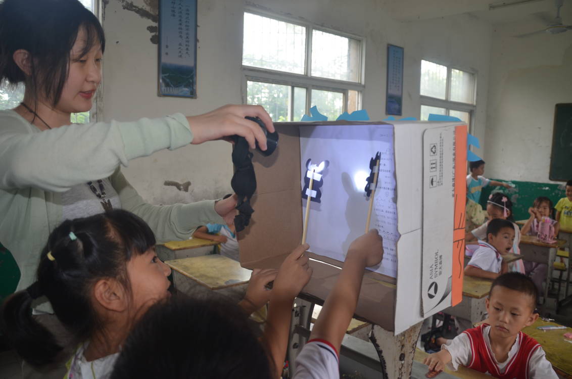 (图为志愿者带学生亲身体验皮影戏)