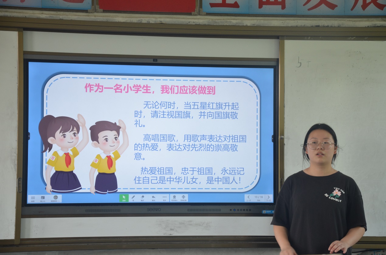 (图为志愿者带领学生学习在国旗下敬礼知识。)