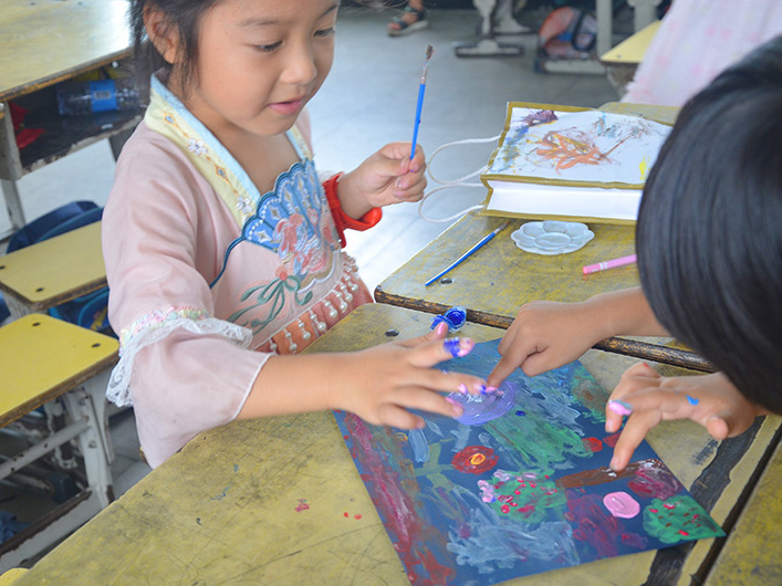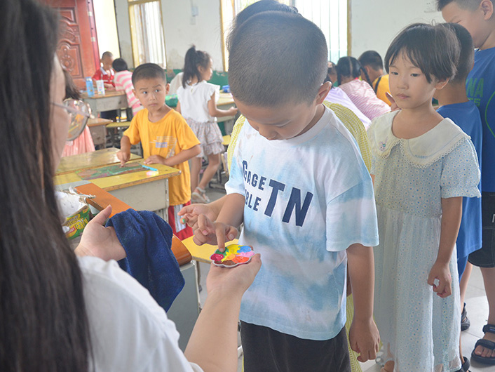 (通讯员 夏玉博)三下乡带给学生追寻更好的未来的机会。为了助力乡村学生实现梦想,7月5日,湖北省第二师范学院四叶草青年志愿服务队到分盐镇开展为期27天的三下乡活动,趁着暑期下乡支教。在志愿者们的带领下,孩子们在乡村小学度过了一节别开生面的美术课。这次特殊的艺术体验并非使用传统画笔或颜料,而是将手指当做画画工具,以独特的方式创作美丽作品。通过这种创新的绘画方式,孩子们得以发挥想象力和创造力,探索不同的表现形式。课程开始,志愿者为学生发纸张,并将颜料展示出来供学生使用,学生的手指蘸取各种鲜艳的颜料,将颜色洒在画纸上。随着指尖在纸上舞动,独特且富有动感的作品逐渐呈现在眼前。志愿者们充满耐心地与孩子们一起,教授他们如何运用手指来创造不同的效果和图案。他们通过示范和解释,引导孩子们掌握基本的技巧,并鼓励他们发挥创造力。在众多欢声笑语中,孩子们积极参与,展现了令人惊叹的才华。每一位志愿者都是学生们创作道路上的良师益友,他们的言传身教让学生们感受到了友善和支持的力量。活动结束时,学生们展示各自的画作,满怀期待地送给自己的好朋友。彼此之间透过创意和祝福,坚定了深厚的友谊,并将这份温暖留存在彼此的心中。通过这次活动,孩子们不仅得到了对艺术的新颖体验,还更加深入地了解了志愿者们的关心和支持。志愿者们用自己的行动向孩子们传递了友善与爱的信息,让他们感受到了美好与快乐。未来,志愿者们将继续秉持着奉献和关爱的精神,为学校社区的发展贡献力量,致力于开展更多类似的活动,为孩子们带去更多美好与快乐。