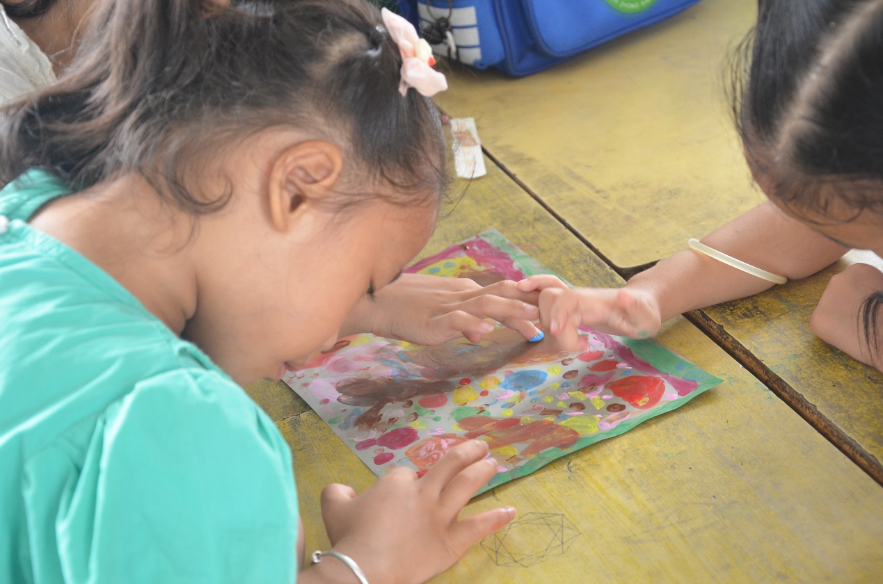 今天,课程在一二年级继续开展。志愿者刘雨梦先是给孩子们带来了一场关于艺术的小讲座,介绍了绘画中各种元素的概念和表达方式。接下来,孩子们亲自动手,开始自己的创作。他们用手指、刷子、海绵等材料,在纸上勾勒出一幅幅鲜艳夺目的画作。伴随着欢快的笑声,孩子们投入到了艺术的海洋中。在课堂上,志愿者为孩子们亲身示范,不时地对学生的绘画提供思路和指导。在她的指导下,孩子们掌握了更多的绘画技巧,并且展现出独具个性的创意和艺术才华。