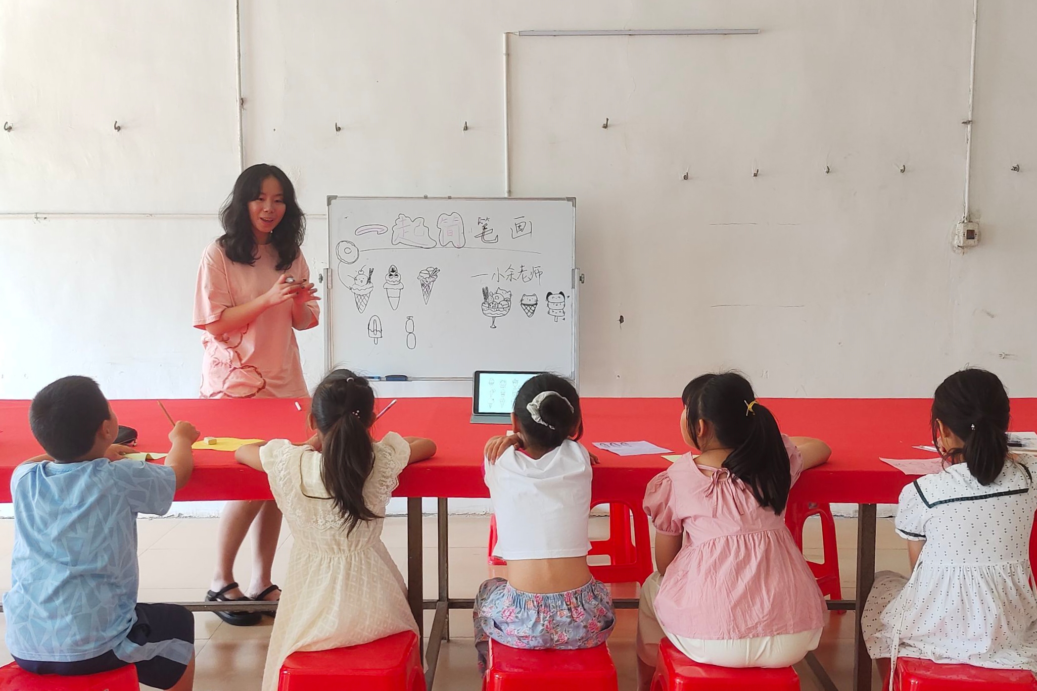 (图为志愿队队员为孩子们讲述简笔画课程)