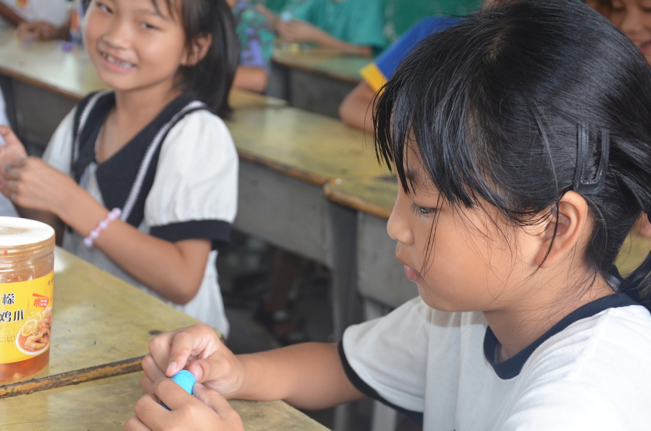 7月24日上午,课程在三四年级开展。志愿者李宇惠先是给孩子们规定了创作方向,为他们分发了黏土,随后孩子们便亲自动手开始了创作。伴随着欢快的笑声,他们投入到了艺术的海洋中。在课堂上,志愿者还不断对学生提供思路和指导,并对富有创意,制作得精美的学生提出了表扬。最后孩子们纷纷向志愿者们展示了自己的作品。