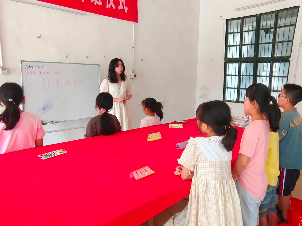 (通讯员 王玥瑶)为弘扬爱国主义精神,普及中国特色社会主义基础教育,进一步提高儿童的爱国爱党意识和自我认同感与归属感,培养儿童最基本的道德修养和情操。7月12日,湖北第二师范学院教育科学学院赴监利市四叶草青年志愿队第7小分队在龚场镇浩宇制衣“希望家园”托管点对该点的儿童进行了红船精神内涵的科普和红船精神现实意义的讲解。此次活动以“开天辟地、敢为人先”的首创精神为指引,以“伟大时代呼唤伟大精神”为主题,通过现场视频播放、红船精神历史事件详情介绍、红色历史故事阅读、有关红船精神诗词鉴赏、聆听并学唱红歌等形式展开。此次活动在一定程度上激发了儿童们对“红色文化”的兴趣和热情,进一步加强了儿童们对党史的了解和学习,促进了其对红色精神的理解,体会了无数先辈在艰辛时刻内心的煎熬与挣扎,并了解了先辈的光荣与成就。正如习近平总书记提出“小小红船承载千钧,播下了中国革命的火种,开启了中国共产党的跨世纪航程。” 启示了我们,弘扬爱国主义精神,肩负新时代重任的使命。另外,在此次活动中,进一步向儿童们贯彻了把握时代的课题,更深入的弘扬了“大胆探索、开拓创新”的精神力量,使儿童们意识到了拥有强大思想武器的重要性。加强了其内心的精神动力,为留守儿童打造了一堂生动鲜活的党史课堂。