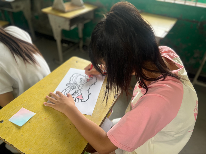 课堂中,志愿者先给学生分发空白的醒狮图案,在让学生上色前,志愿者先给学生讲解常见的醒狮外形特点和色彩搭配,并播放了一个舞狮的视频,激发学生的课堂兴趣。同时,志愿者给学生讲解了叠色、混色、色块、线条等方式,用以表现狮头的色彩,让学生围绕着醒狮展开创作,感受中国悠久的醒狮文化,学习色彩、图案、线条,并大胆地表现,造型生动,细节丰富,体现出醒狮富有特征的色彩和花纹。志愿者告诉学生,涂色时可以选择一些鲜艳活泼的颜色进行上色,来体现传统民间艺术的美感。