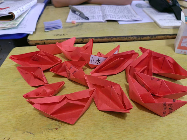 课堂的最后,志愿者为同学们设计了一个游戏环节——将自己的感悟以及想说的话写在红色的纸上,再将它折成小船的模样。一张张相同的纸上是各种不同的笔迹,也许每位同学折的小船有大有小,有好有差,但同学们爱国的情怀相同的炙热。