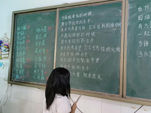 (图为老师板书歌词供学生记忆)