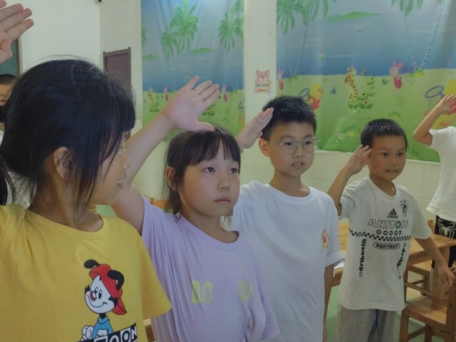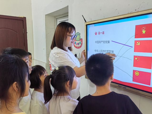 实践团将当地儿童按年级分为两个课堂,将一二三年级和四五六年级化为红领巾大课堂和红领巾小课堂,针对学生不同年级和特点开展特色党史教育。在红领巾小课堂上,实践团带领学生们认识党徽党旗,了解党的成立等基础知识,其中设立不同的互动环境加强学生对党的认识,在课程末志愿者带领学生们一起对着国旗行队礼,加强学生爱国爱党意识。在红领巾大课堂,实践团以“红船精神”为切入点,以视频导入,而后以《红船,从南湖启航》一文加强学生对红船精神具体内涵的理解,除此之外实践团还引导学生还以小组形式分别从百年党史中挖掘具体人物实际,加强内涵理解;最后学生们将自己的感悟和理想写在纸上并折成红船,加强学生们的文化自信。