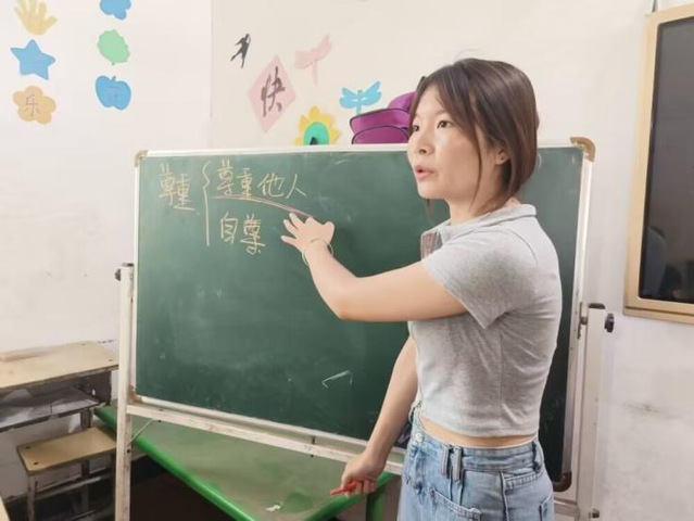 (图为四叶草青年志愿服务队志愿者邹贤艳向学生讲解关于“尊重”的解释)