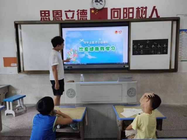 (图为四叶草青年志愿服务队志愿者带领学生学习“饮食健康”的相关知识)
