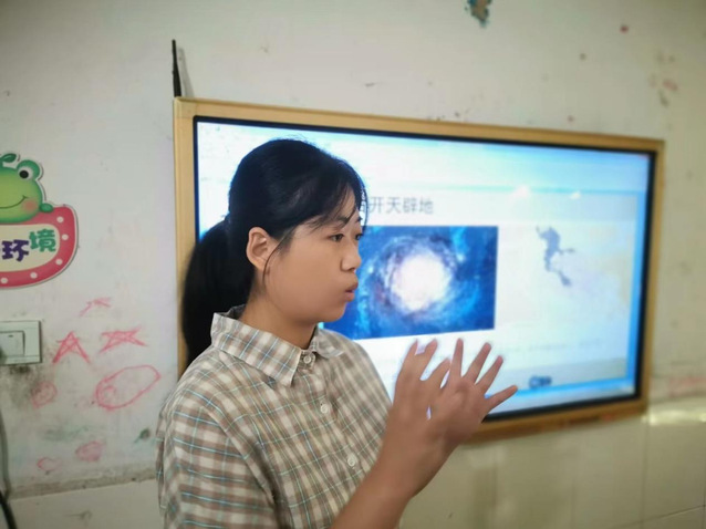 在课堂上,四叶草青年志愿服务队的队员以生动有趣的方式,将盘古开天的故事娓娓道来。志愿者王姝杰利用动画视频等多媒体手段,形象地展示了盘古如何用斧头劈开混沌,以及这一过程背后的科学原理。孩子们听得津津有味,不时发出惊叹和欢笑声。
