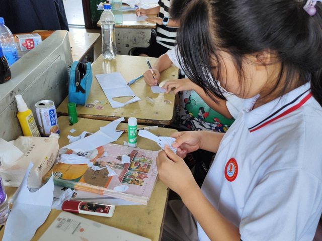 在志愿者的带领下,同学们一起探寻端午节的由来,诵读端午民俗诗歌、屈原诗词和历代爱国主义诗篇。同学们在诵读中感受了端午节的文化内涵;明白了端午节不只是粽子节、龙舟节,更是民族节、爱国节;也了解了端午节的有关传说和习俗,将“棕香文化”熟记于心。同时,为进一步激发学生对传统文化的热爱,志愿者在课堂中上教同学们如何自制一个端午香包,同学们大展身手、各尽所能,将一张张白纸,折叠、裁剪、涂色,做成一个个琳琅满目、造型奇特的粽子香包。