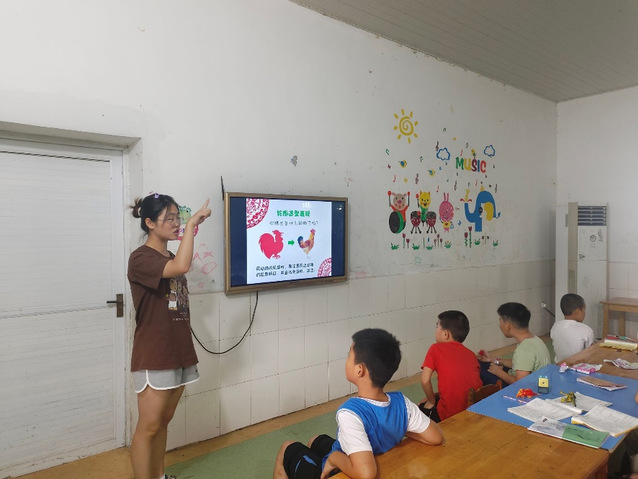 (志愿者正在与小朋友互动,引导他们了解剪纸的基本纹样)