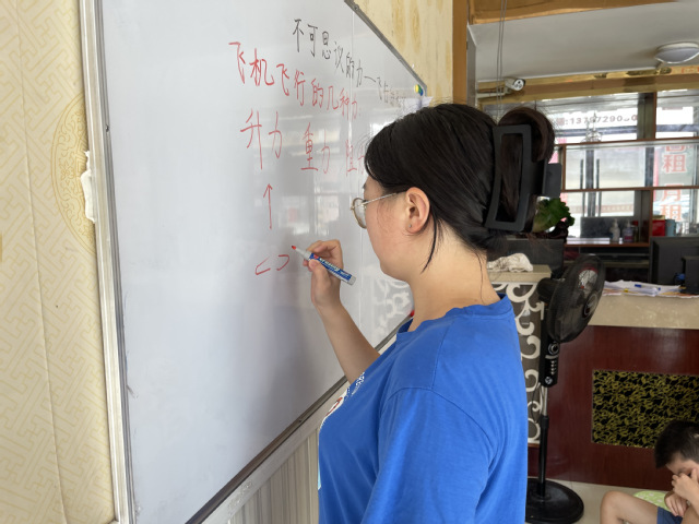 (通讯员 方登垅 李袁潇)飞机为什么可以在天空随意飞行?看到飞机,总会被一股神奇的力量吸引,因为这股神奇的力量,飞机可以在天空飞行。为了让同学们了解一些生活常识,可以解释一些简单生活现象,增加知识储备,学会运用所学知识,灵活处理生活中的小问题,湖北第二师范学院四叶草青年志愿服务队第三分队志愿者来到湖北省荆州市监利县分盐镇浩宇制衣厂暑期托管班为同学们带去了一节了解飞机的知识课。在上课之前,志愿者老师通过提问的方式,让同学们说一说生活中一些现象发生的原因,同学们对一些现象的解释是对的,但缺少理论性。在课堂上,志愿者老师着重向同学们解释了飞机飞行过程所受到的力,并详细说明了这个力之间的关系以及各自的作用。同学们认真听讲,未理解的知识,也会再次询问志愿者老师,志愿者老师同样也会认真讲解,并用生活中的小现象加深同学们的理解。整个课堂的氛围变得活跃,同学们与志愿者老师的互动性也得以提高。