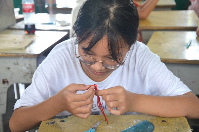 此次课程于7月27日首先在五六年级开展。志愿者们为他们提供了编织所需的材料和工具,并亲切地向他们介绍了中国结的历史、文化背景及编织技巧。此外,志愿者还与孩子们进行了一对一的教学,帮助他们掌握基本的编织技巧。在编织课上,孩子们饶有兴致地将红色的丝线穿过小孔,交织出独特、精美的中国结。他们互相交流,分享编织技巧和心得体会,不仅增进了彼此的友谊,还提高了沟通协作能力。中国结作为中国传统手工艺的代表之一,在编织过程中需要耐心、巧妙的手法以及对美的追求。