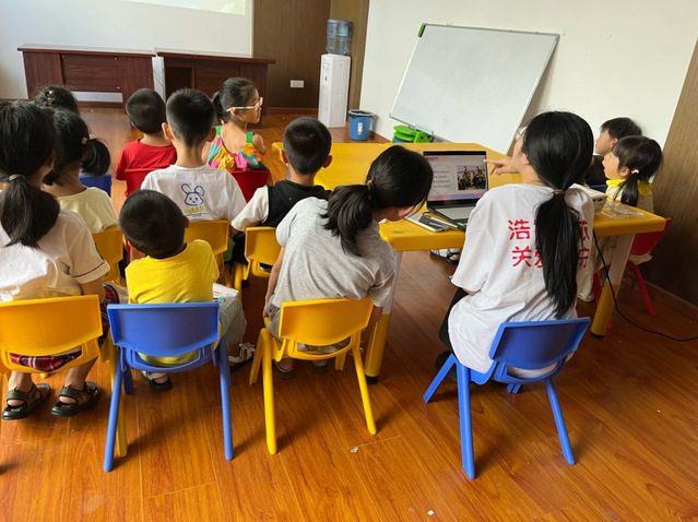 (图为小朋友们认真倾听志愿者老师的讲解)
